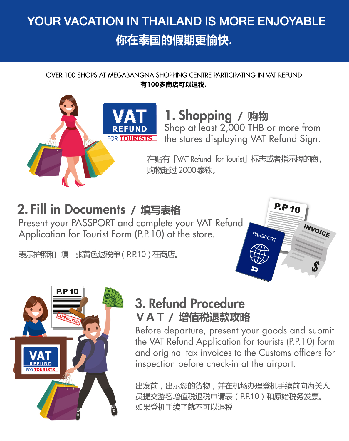 Various services and facilities are available to support your visit at our centre such as Free Shuttle Bus from BTS (Sky Train) Udomsuk Station (exit 5) to Megabangna Shopping Centre, Tourist service counter at Level 1, free baggage storage service, muslim prayer room and free wifi. The tourists could get a Tourist Discount Booklet at our information counter to enjoy many privileges from participating stores/shops and with spending of 500THB/receipt/passport, the tourists could redeem for A Yak Tai Aroma Inhaler.