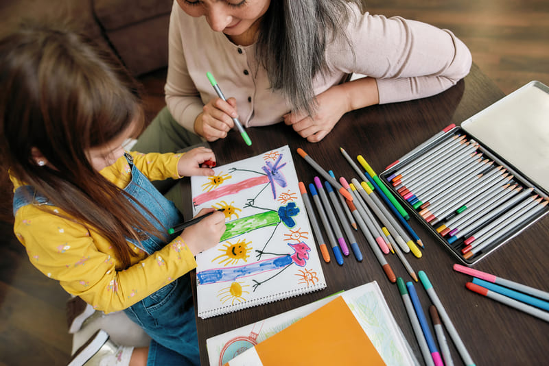 การขีดเขียนคือจุดเริ่มต้นของการสร้างสรรค์งานศิลปะ ซึ่งการให้ลูกได้ละเลงสีสันลงบนกระดาษช่วยฝึกความมั่นคงของข้อมือ และเป็นการระบายความรู้สึก จินตนาการต่าง ๆ ออกมาเป็นภาพวาด