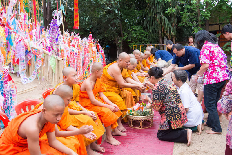 การทำบุญวันสงกรานต์ถือเป็นสิริมงคลปฐมฤกษ์ของปี พุทธศาสนิกชนมักจะตื่นแต่เช้าเพื่อเตรียมอาหารคาวหวานไปทำบุญตักบาตรที่วัด ฟังเทศน์ฟังธรรม และอุทิศส่วนกุศลให้แก่บรรพบุรุษผู้ล่วงลับ ถือเป็นการเริ่มต้นปีใหม่ด้วยจิตใจที่บริสุทธิ์และผ่องใส