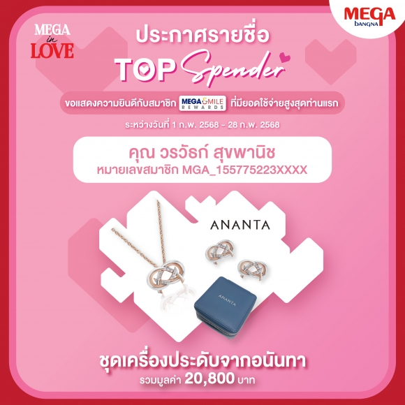 ขอแสดงความยินดีกับ สมาชิก Mega Smile Rewards ที่มียอดใช้จ่ายสูงสุดในร้านค้าหมวดแม่และเด็ก และ เมกา สมาร์ท คิดส์ ในระหว่างวันที่ 6 ม.ค. 67 – 31 ม.ค. 67