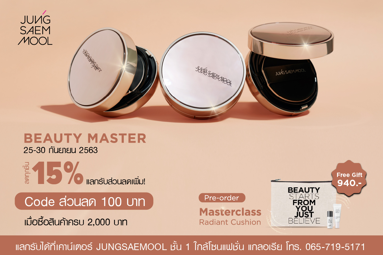แลกรับ! ฟรี โค้ดส่วนลด 100 บาท สำหรับลดเพิ่ม เมื่อซื้อเครื่องสำอาง JUNGSAEMMOOL ใดๆ ครบ 2,000 บาทขึ้นไป ง่ายๆ เพียงใช้คะแนน Mega Smile Rewards 0 คะแนน 25-30 ก.ย. 2563 พิเศษ! พรีออร์เดอร์ Masterclass Radiant Cushion รับของขวัญ 3 ชิ้น มูลค่า 940 บาท