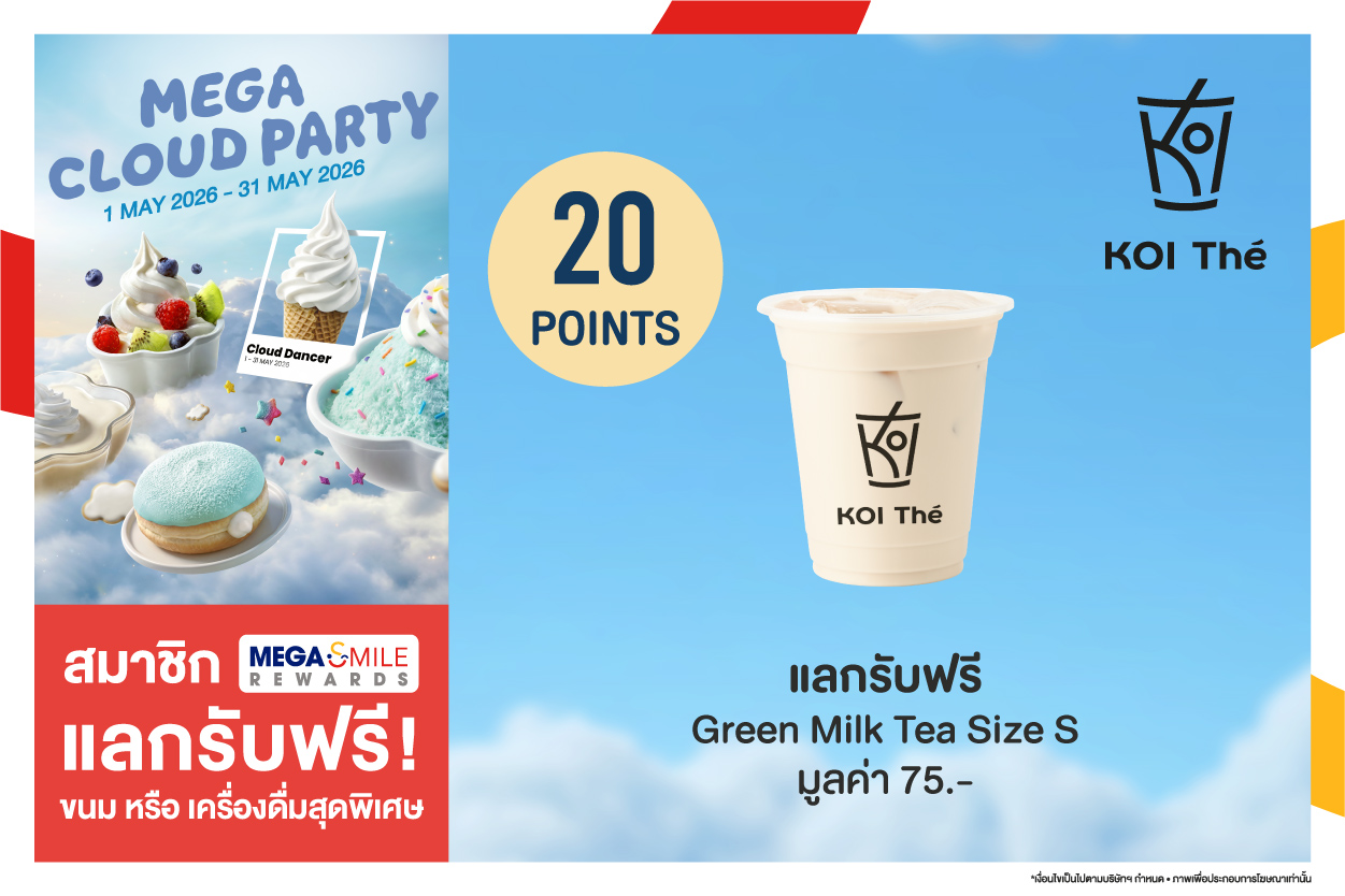 1. สิทธิพิเศษ สำหรับสมาชิก Mega Smile Rewards 2. กรุณาอ่านเงื่อนไขก่อนแลกคูปอง เนื่องจากคูปองจะมีอายุ 30 นาทีหลังจากกดยืนยันการแลก ในกรณีที่มีการกดแลกรับคูปองแทนเงินสด หรือส่วนลด หรือสินค้าฟรีแล้ว แต่ยังไม่มารับสินค้าที่เคาน์เตอร์ จะไม่สามารถนำสิทธิ์มาใช้ได้อีก ไม่ว่ากรณีใดก็ตาม และทางบริษัทฯ ขอสงวนสิทธิ์ในการไม่ชดเชยคะแนน และคูปองให้ในทุกกรณี 3. แลกรับสิทธิ์ได้ที่ร้านค้า/ร้านอาหารที่ร่วมรายการ สาขาเมกาบางนาเท่านั้น 4. แลกรับสิทธิ์ได้ตั้งแต่วันที่ 1 พ.ค. 69 - 31 พ.ค 69 หรือจนกว่าสิทธิ์จะหมด 5. ไม่สามารถใช้คูปองที่เกิดจากการ Capture หรือถ่ายภาพจากหน้าจอมือถือได้ 6. บริษัทฯ ขอสงวนสิทธิ์การแก้ไขหรือเปลี่ยนแปลงเงื่อนไขต่าง ๆ โดยไม่ต้องแจ้งให้ทราบล่วงหน้า 7. คูปองไม่สามารถเปลี่ยนหรือทอนเป็นเงินสดได้ 8. สามารถสอบถามข้อมูลเพิ่มเติม โทร. 02-105-1000 9. ไม่สามารถใช้ร่วมกับบริการเดลิเวอร์รี่