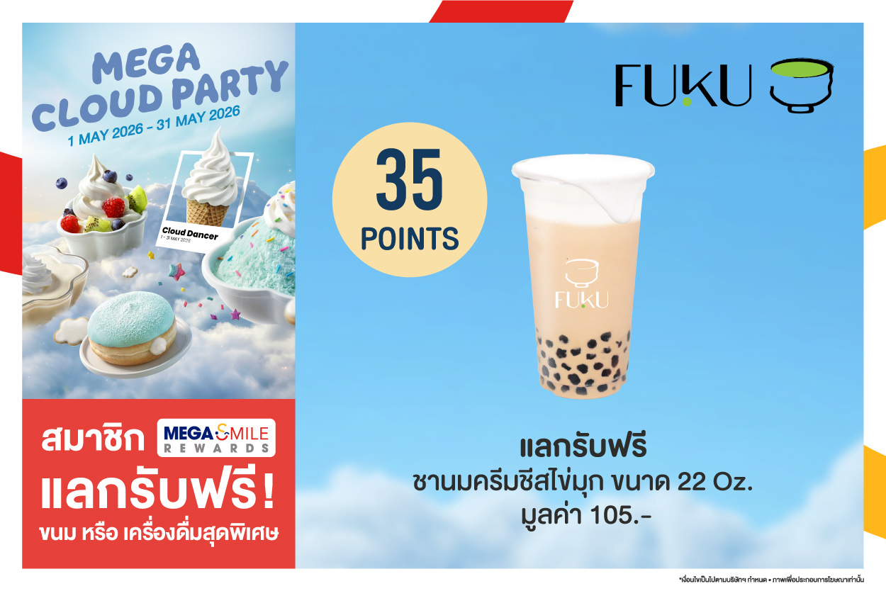 1. สิทธิพิเศษ สำหรับสมาชิก Mega Smile Rewards 2. กรุณาอ่านเงื่อนไขก่อนแลกคูปอง เนื่องจากคูปองจะมีอายุ 30 นาทีหลังจากกดยืนยันการแลก ในกรณีที่มีการกดแลกรับคูปองแทนเงินสด หรือส่วนลด หรือสินค้าฟรีแล้ว แต่ยังไม่มารับสินค้าที่เคาน์เตอร์ จะไม่สามารถนำสิทธิ์มาใช้ได้อีก ไม่ว่ากรณีใดก็ตาม และทางบริษัทฯ ขอสงวนสิทธิ์ในการไม่ชดเชยคะแนน และคูปองให้ในทุกกรณี 3. แลกรับสิทธิ์ได้ที่ร้านค้า/ร้านอาหารที่ร่วมรายการ สาขาเมกาบางนาเท่านั้น 4. แลกรับสิทธิ์ได้ตั้งแต่วันที่ 1 พ.ค. 69 - 31 พ.ค 69 หรือจนกว่าสิทธิ์จะหมด 5. ไม่สามารถใช้คูปองที่เกิดจากการ Capture หรือถ่ายภาพจากหน้าจอมือถือได้ 6. บริษัทฯ ขอสงวนสิทธิ์การแก้ไขหรือเปลี่ยนแปลงเงื่อนไขต่าง ๆ โดยไม่ต้องแจ้งให้ทราบล่วงหน้า 7. คูปองไม่สามารถเปลี่ยนหรือทอนเป็นเงินสดได้ 8. สามารถสอบถามข้อมูลเพิ่มเติม โทร. 02-105-1000 9. ไม่สามารถใช้ร่วมกับบริการเดลิเวอร์รี่