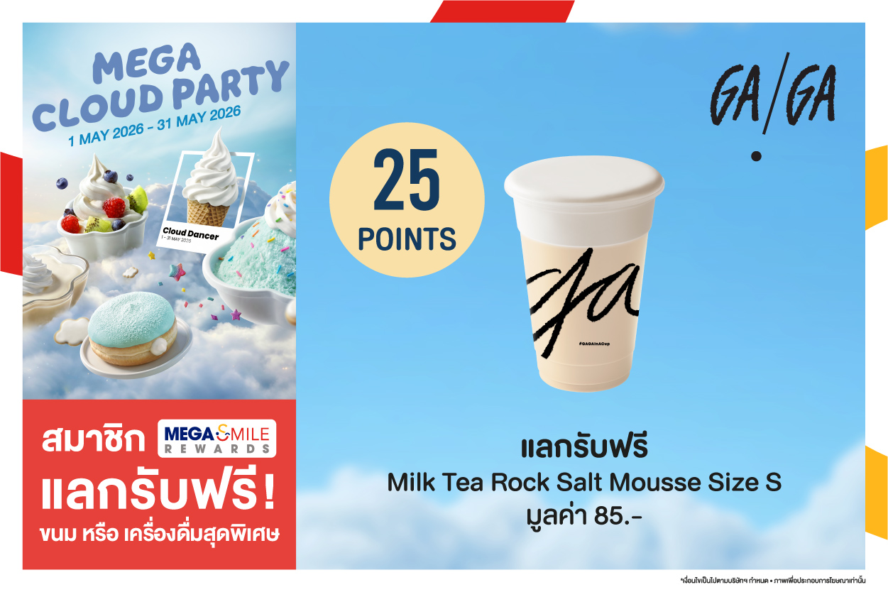 1. สิทธิพิเศษ สำหรับสมาชิก Mega Smile Rewards 2. กรุณาอ่านเงื่อนไขก่อนแลกคูปอง เนื่องจากคูปองจะมีอายุ 30 นาทีหลังจากกดยืนยันการแลก ในกรณีที่มีการกดแลกรับคูปองแทนเงินสด หรือส่วนลด หรือสินค้าฟรีแล้ว แต่ยังไม่มารับสินค้าที่เคาน์เตอร์ จะไม่สามารถนำสิทธิ์มาใช้ได้อีก ไม่ว่ากรณีใดก็ตาม และทางบริษัทฯ ขอสงวนสิทธิ์ในการไม่ชดเชยคะแนน และคูปองให้ในทุกกรณี 3. แลกรับสิทธิ์ได้ที่ร้านค้า/ร้านอาหารที่ร่วมรายการ สาขาเมกาบางนาเท่านั้น 4. แลกรับสิทธิ์ได้ตั้งแต่วันที่ 1 พ.ค. 69 - 31 พ.ค 69 หรือจนกว่าสิทธิ์จะหมด 5. ไม่สามารถใช้คูปองที่เกิดจากการ Capture หรือถ่ายภาพจากหน้าจอมือถือได้ 6. บริษัทฯ ขอสงวนสิทธิ์การแก้ไขหรือเปลี่ยนแปลงเงื่อนไขต่าง ๆ โดยไม่ต้องแจ้งให้ทราบล่วงหน้า 7. คูปองไม่สามารถเปลี่ยนหรือทอนเป็นเงินสดได้ 8. สามารถสอบถามข้อมูลเพิ่มเติม โทร. 02-105-1000 9. ไม่สามารถใช้ร่วมกับบริการเดลิเวอร์รี่