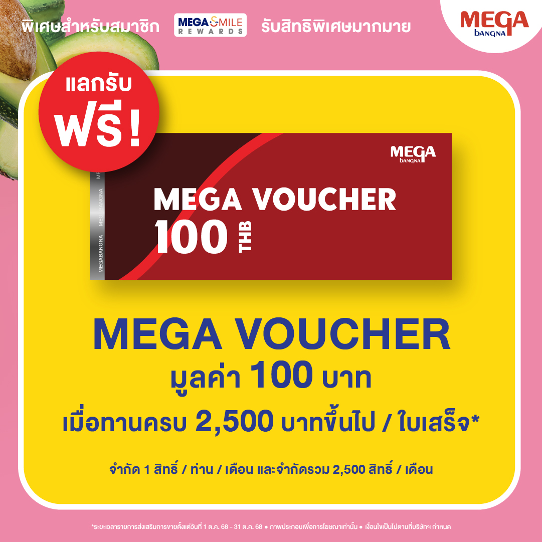 เมื่อมียอดใช้จ่ายสะสมหมวดร้านอาหาร และ/หรือ หมวดช้อปปิ้ง 2,000 บาทขึ้นไป รับ Mega Voucher มูลค่า 100 บาท