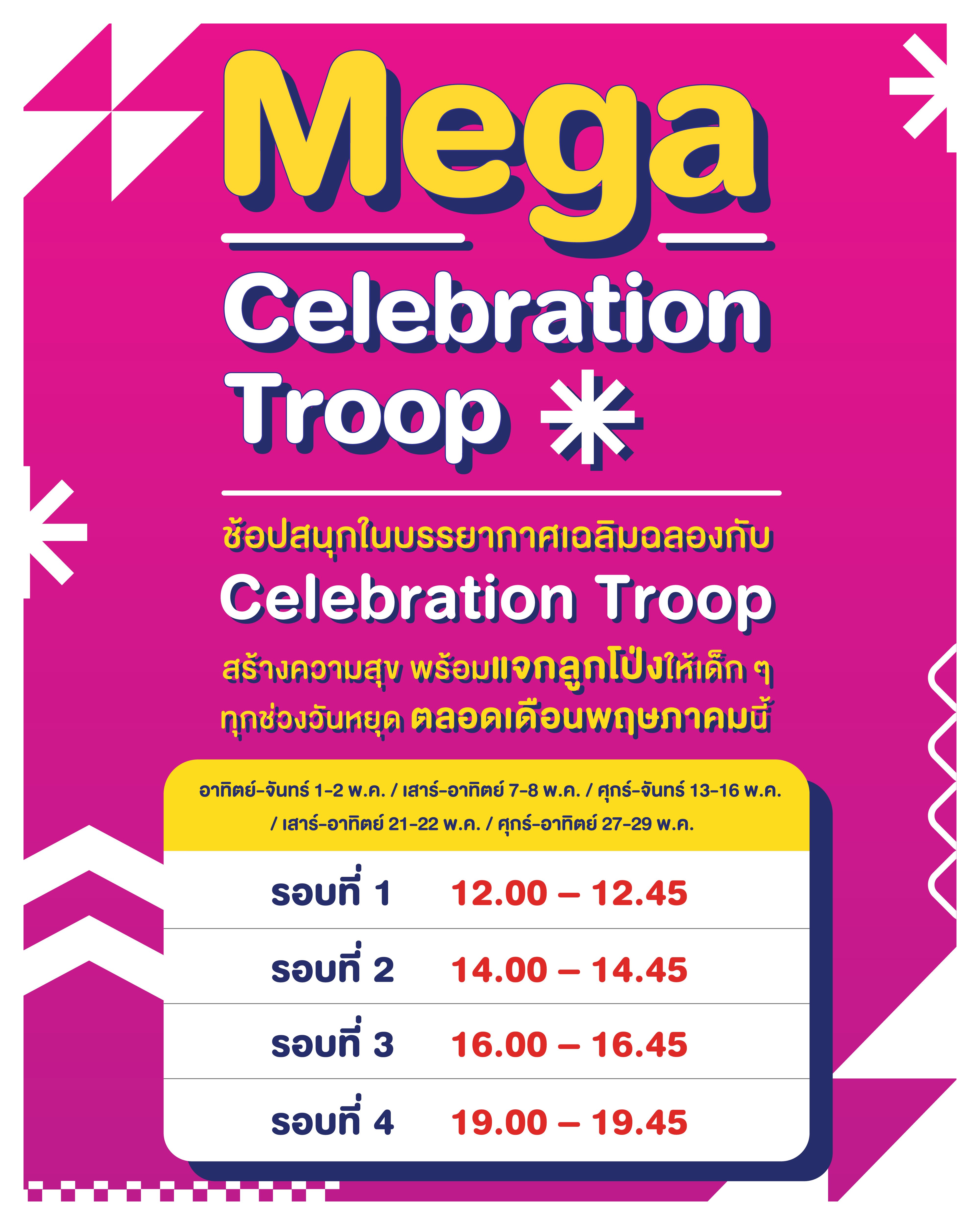 เมกาบางนา ชวนคุณมาช้อปสนุก เพิ่มเติมความสุขไปด้วยกันกับ “Celebration Troop” ที่จะมาสร้างสีสัน เสียงหัวเราะ และรอยยิ้ม พร้อมแจกลูกโป่งให้เด็ก ๆ ในทุกช่วงวันหยุดตลอดเดือนพฤษภาคมนี้ แล้วพบกันที่เมกาบางนานะคะ