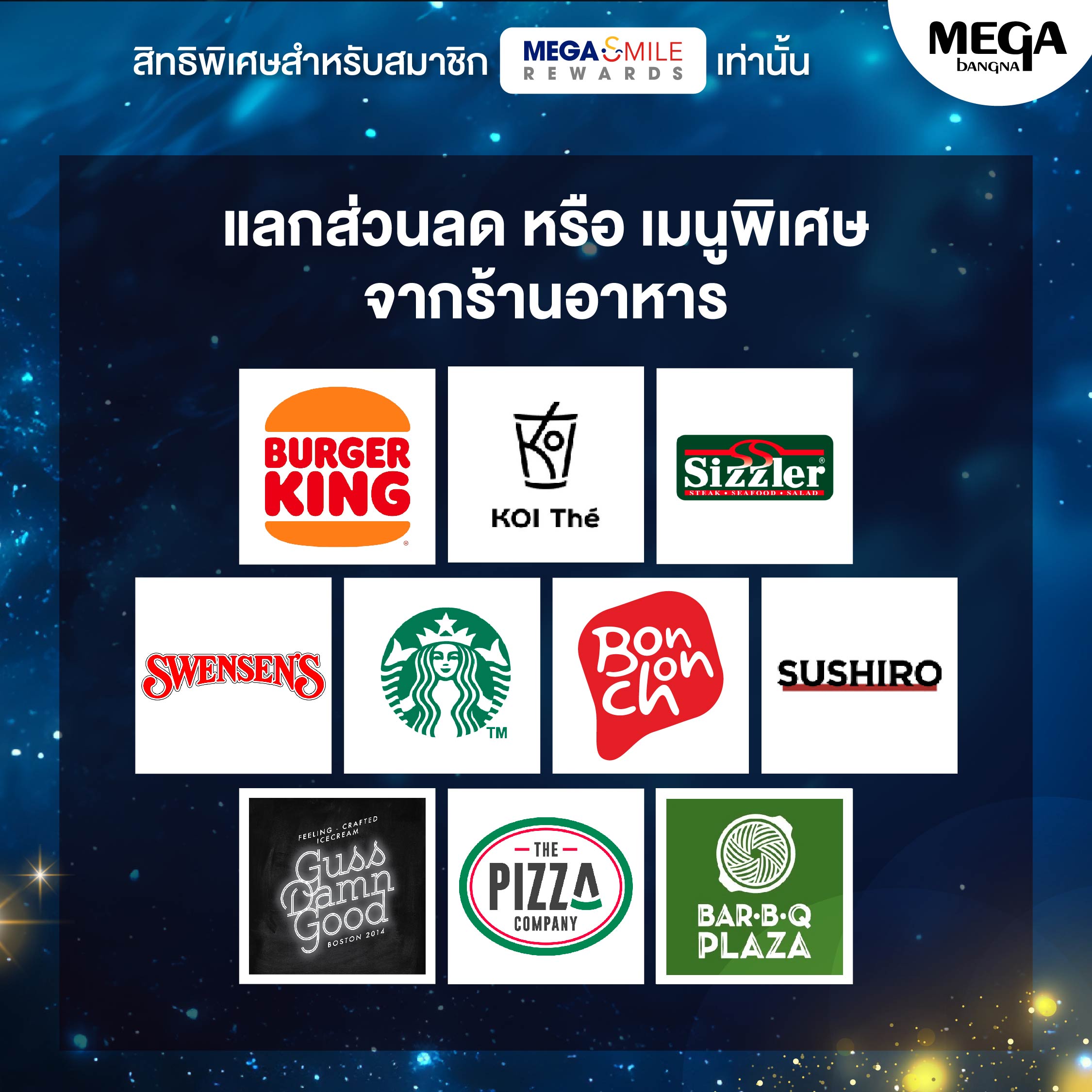 BURGER KING, BONCHON, KOI THE, STARBUCKS, SUSHIRO, SIZZLER, SWENSEN’S, GUSS DAMN GOOD และ BAR-B-Q PLAZA, THE PIZZA COMPANY