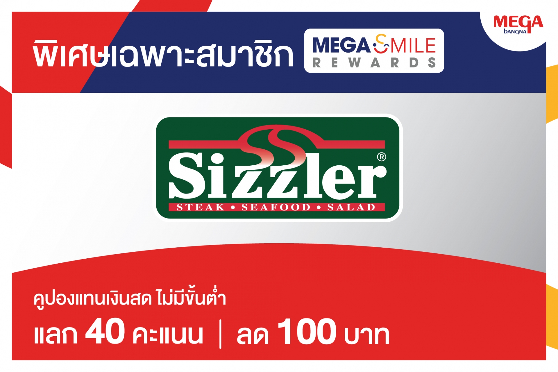 แลกรับ Sizzler E-Voucher มูลค่า 100 บาท เพียงใช้คะแนน Mega Smile Rewards 40 คะแนน